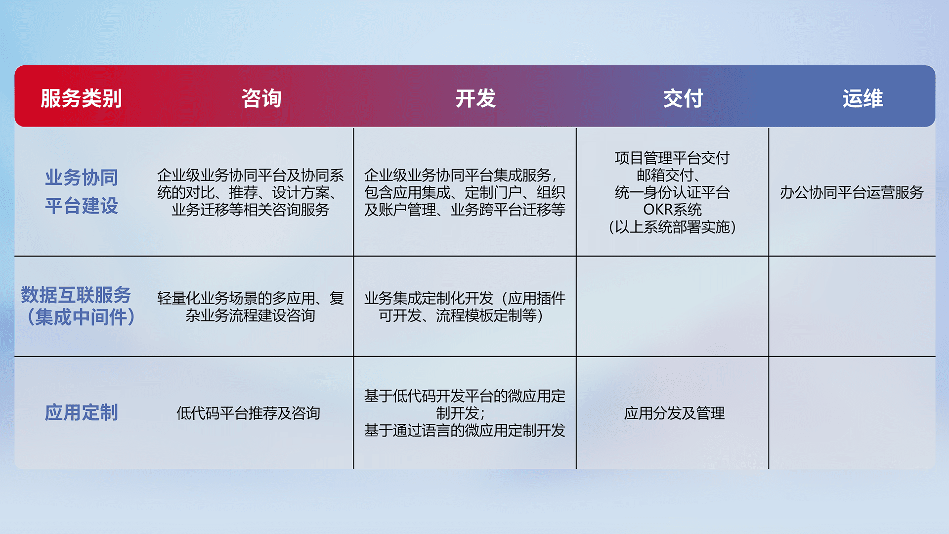 针对钉钉、、、企微、、、、IDaas等平台级产品提供产品的规划、、方案、、交付、、、、定制化开发等服务,,,实现如统一协同办公、、、智能客户服务、、、、混合会议管理、、、、智能数据查询、、、、等业务场景,,,,实现数字化转型。。